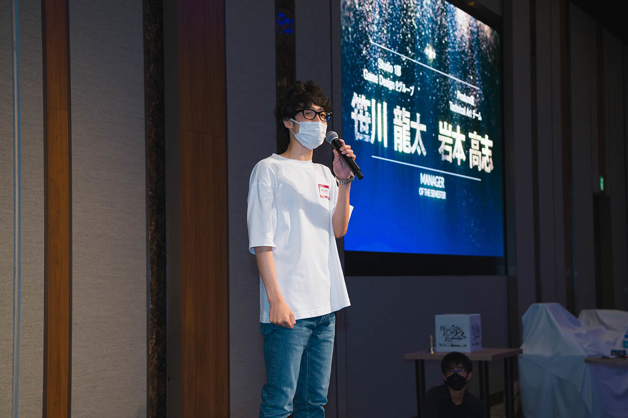 さらに、2Dゲームが主体だったライトフライヤースタジオが、ハイクオリティな3Dをつくれるようになるまで、積み重ねと執念を繰り返したとして「ライトフライヤースタジオ 3D技術&組織づくりProject」に携わったStudio本部 Studio1部 副部長の岩本 大祐、Studio本部 Studio 2部 Art3グループ シニアマネージャーの山本 祐も受賞。(岩本はオンライン参加のため、山本のみ壇上へ)